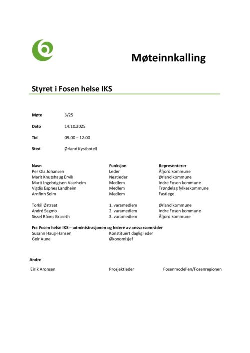 Møteinnkalling til styret i Fosen helse IKS 14102025