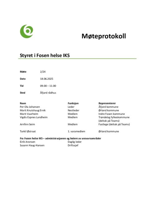 Møteprotokoll styret i Fosen helse IKS 18062025