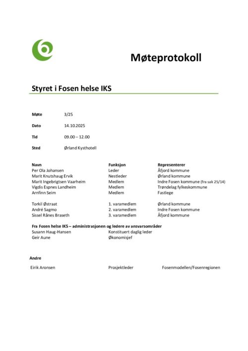 Møteprotokoll til styret i Fosen helse IKS 141020251